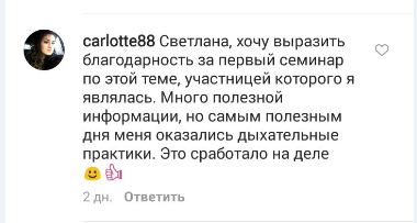 Светлана, хочу выразить благодарность за первый семинар по этой теме, участницей которого я являлась. Много полезной информации, но самым полезным для меня оказались дыхательные практики. Это сработало на деле. Оригинал отзыва