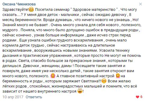 Посетила семинар » Здоровое материнство » . Что могу сказать….? У меня двое деток — мальчики , сейчас ожидаю девочку , 8 месяц беременности. Вроде думаешь , что ничего нового не узнаешь , Но! Знаний много не бывает . Очень много узнала для себя нового , полезного, мудрого . Поняла, что много было допущено ошибок в предыдущие роды , сейчас конечно , узнав больше информации , даже исчез страх перед родами . Еще узнала ошибки грудного вскармливания , очень мало кормила деток грудью , сейчас настраиваюсь на длительное вскармливание , вооружившись новыми знаниями. Усвоила технику дыхания и практические упражнения , которые просто Не могут не помочь в родах. Света, спасибо большое за прекрасные знания , которыми ты делишься. Девочки , женщины, дамы ! Посещаете такие занятия и поверьте, даже имея уже несколько детей , такие занятия откроют вам много нового, полезного. А главное позитивный настрой на беременность и роды , которым заряжает Светлана!!! Всем желаю лёгких родов , спокойных, жизнерадостных малышей и помните, что всё зависит от нашего внутреннего настроя! Оригинал отзыва