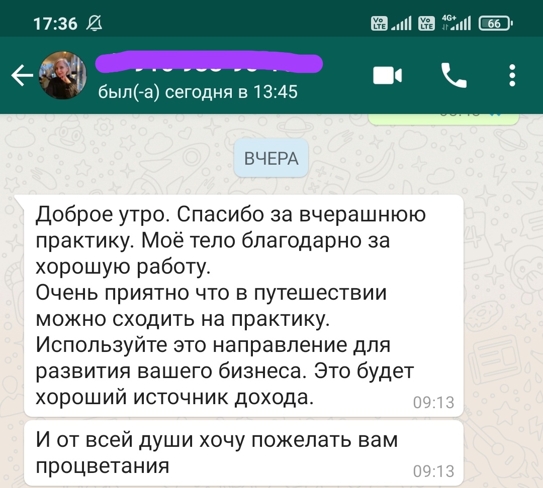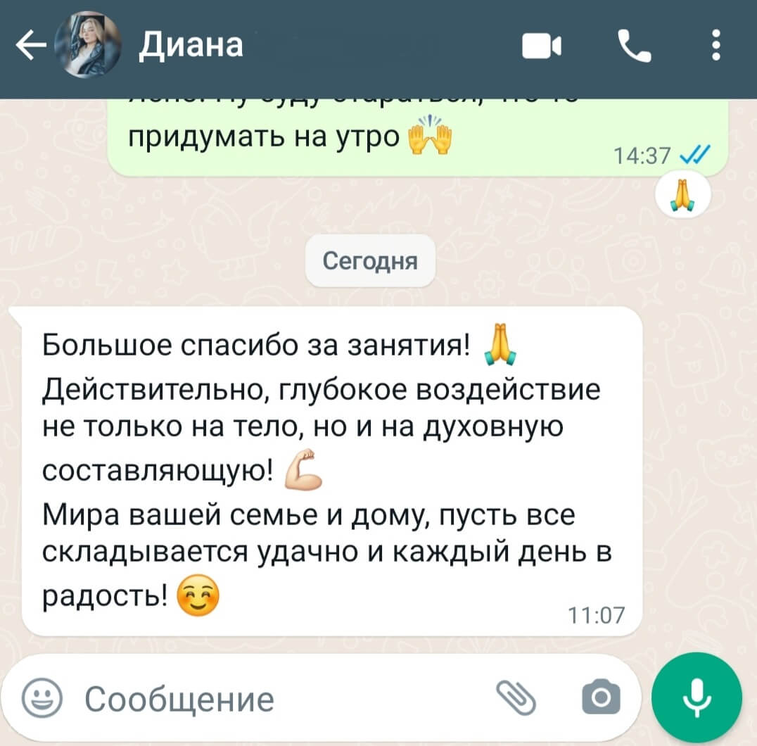 Спасибо за вчерашнюю практику. Моё тело благодарно ха хорошую работу. Очень приятно, что в путешествии можно сходить на практику. Используйте это направление для развития вашего бизнеса. Это будет хороший источник дохода. И от всей души хочу пожелать вам процветания. Оригинал отзыва