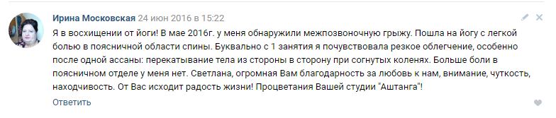 Я в восхищении от йоги! В мае 2016 г. у меня обнаружили межпозвоночную грыжу. Пошла на йогу с легкой болью в поясничной области спины. Буквально с 1 занятия я почувствовала резкое облегчение, особенно после одной асаны: перекатывание тела из стороны в сторону при согнутых коленях. Больше боли в поясничном отделе у меня нет. Светлана, огромная Вам благодарность за любовь к нам, внимание, чуткость, находчивость. От Вас исходит радость жизни! Процветания Вашей студии «Аштанга»! Оригинал отзыва