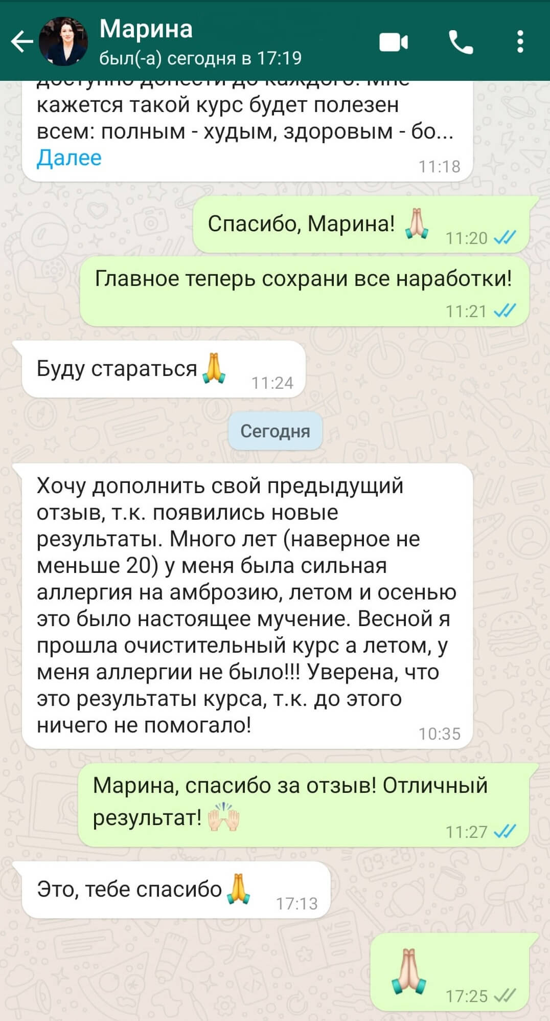 Хочу дополнить свой предыдущий отзыв (от 17.06.21 г.), т.к. появились новые результаты. Много лет (наверное не меньше 20) у меня была сильная аллергия на амброзию, летом и осенью это было настоящее мучение. Весной я прошла очистительный курс а летом, у меня аллергии не было!!! Уверена, что это результаты курса, т.к. до этого ничего не помогало! Оригинал отзыва