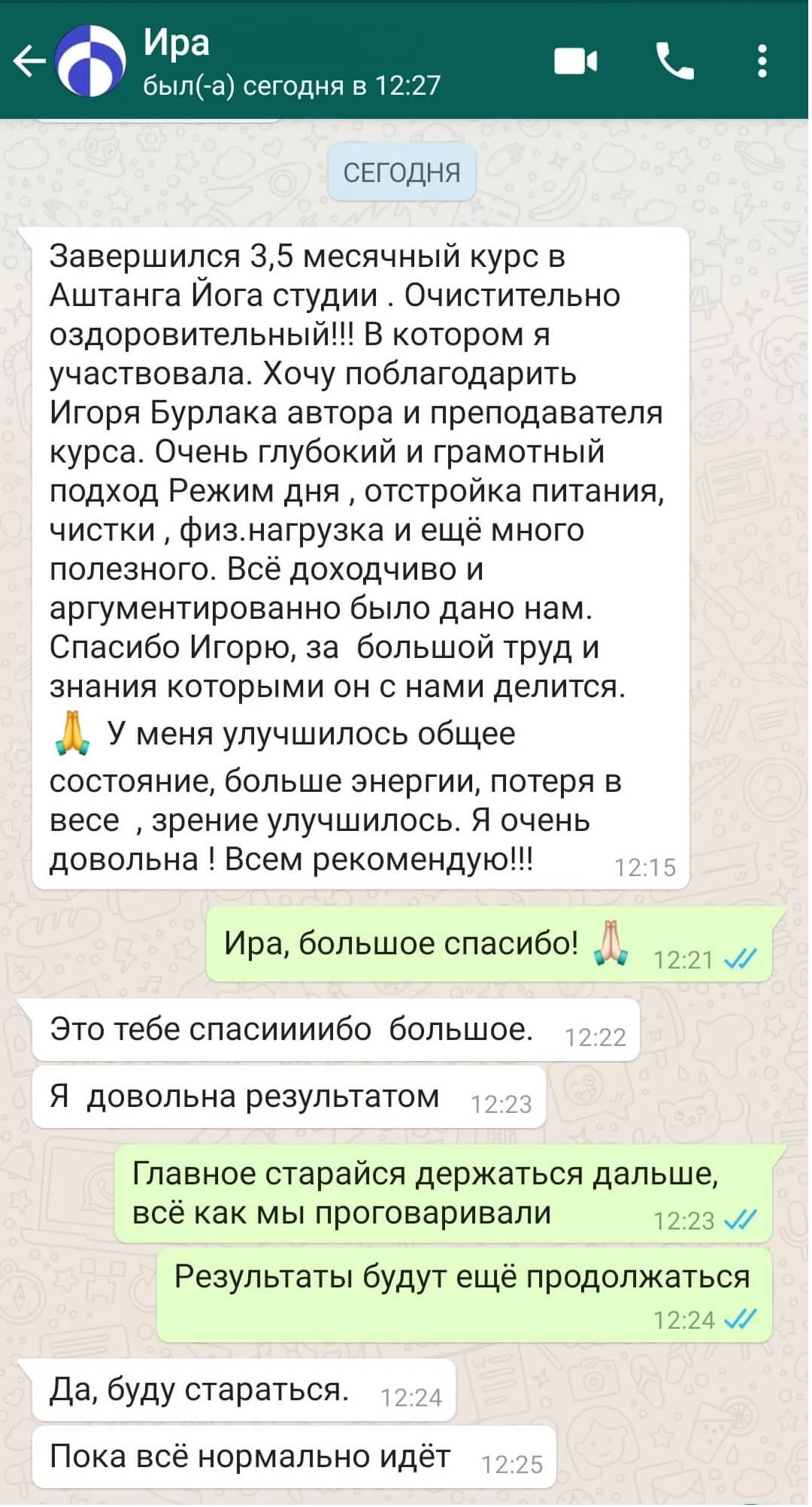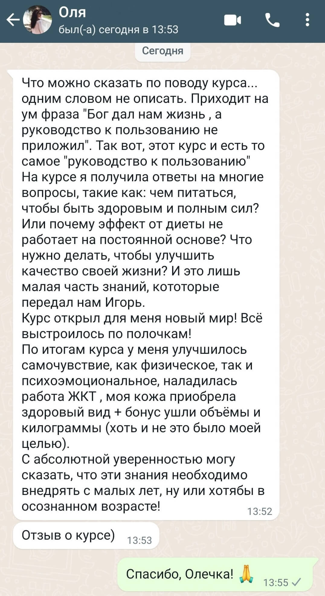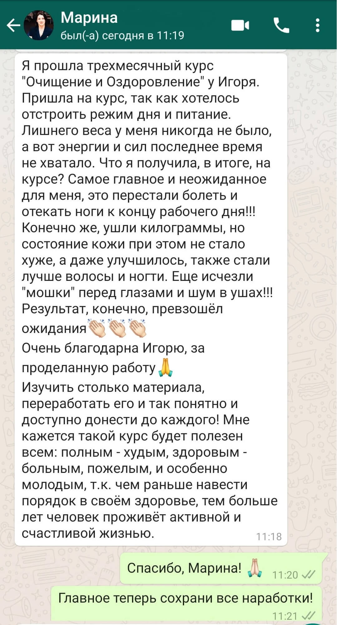 Хочу оставить отзыв о пройденном мною курсе «Очищение и оздоровление». Я получила много новой для себя информации о настройке здорового питания, режиме и образе жизни, а самое главное получилось внедрить эту информацию в свою повседневную жизнь. До курса моё питание было не вполне здоровым, и это отражалось на моём общем состоянии(были проблемы с желудком и кишечником, частые депрессивные состояния, апатия, усталость. Уже в процессе прохождения курса начались улучшения моего состояния. Легко получилось настроить режим дня и питания, общее состояние улучшилось, появилось больше сил и энергии. Вес снизился на 5 кг. Хочется отметить, что во время теоретических занятий было много полезной и познавательной информации, которая легко воспринималась, и я всегда посещала их с удовольствием.Они дают огромную мотивацию и настрой держать правильный курс и не сходить с начатого пути. Игорь, огромное вам спасибо, благодаря вашему курсу я поняла важность здорового и чистого питания, насколько всё это результативно. Оригинал отзыва