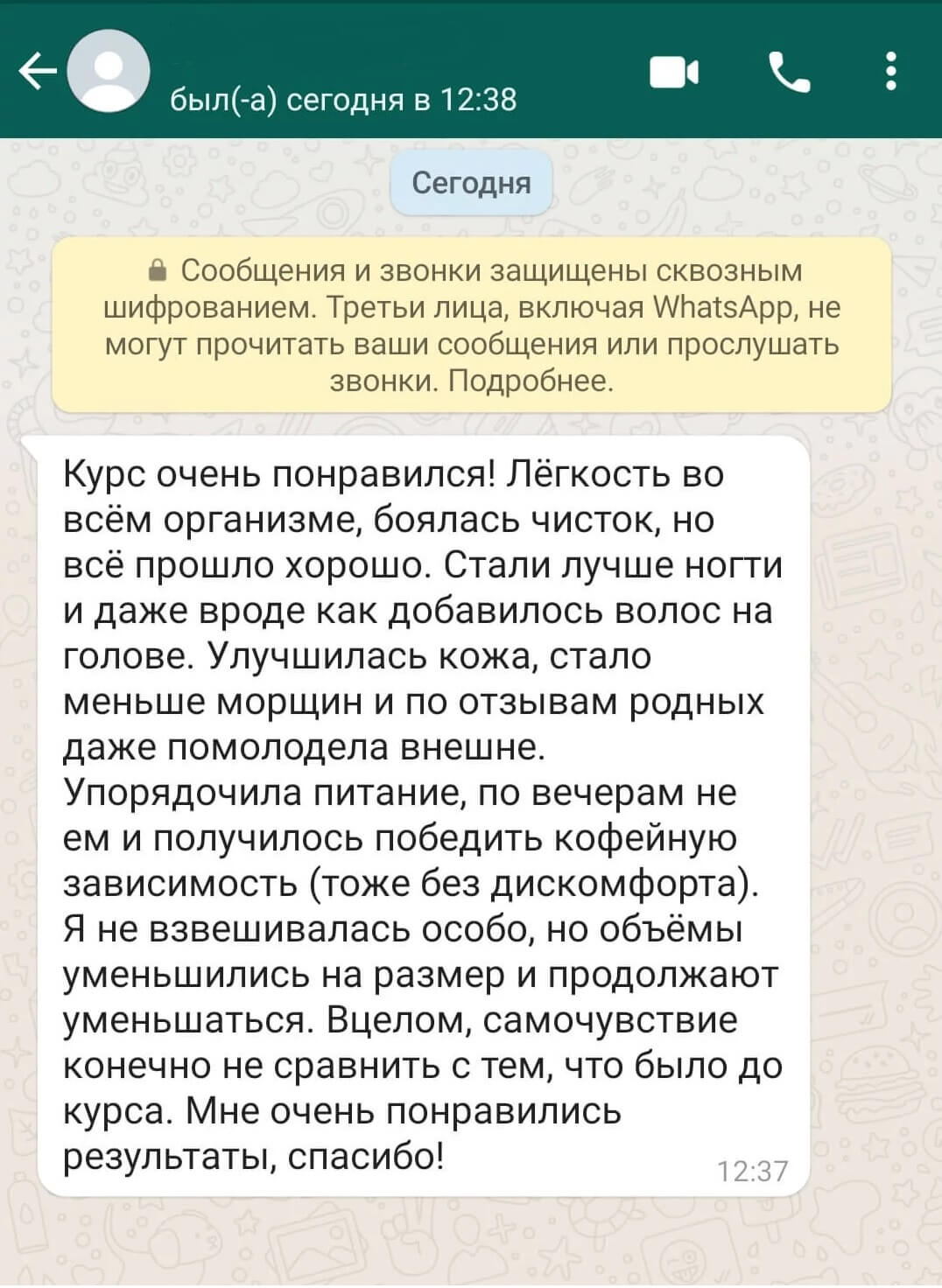 По итогам курса у меня улучшилось самочувствие, как физическое, так и психоэмоциональное, наладилась работа ЖКТ , моя кожа приобрела здоровый вид + бонус ушли объёмы и килограммы (хоть и не это было моей целью).