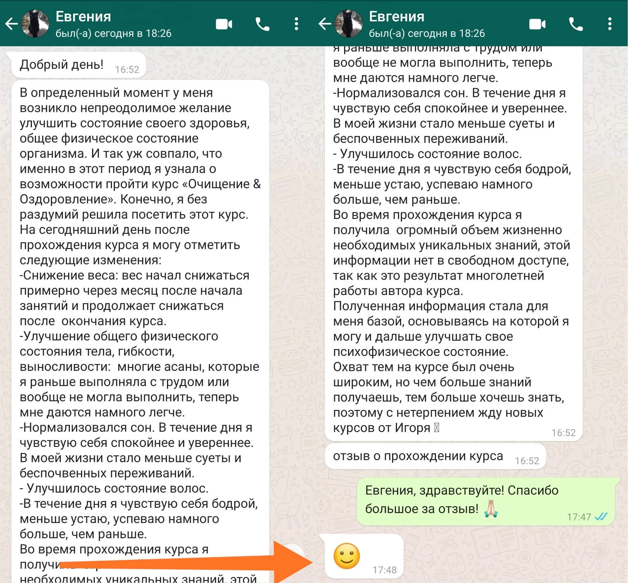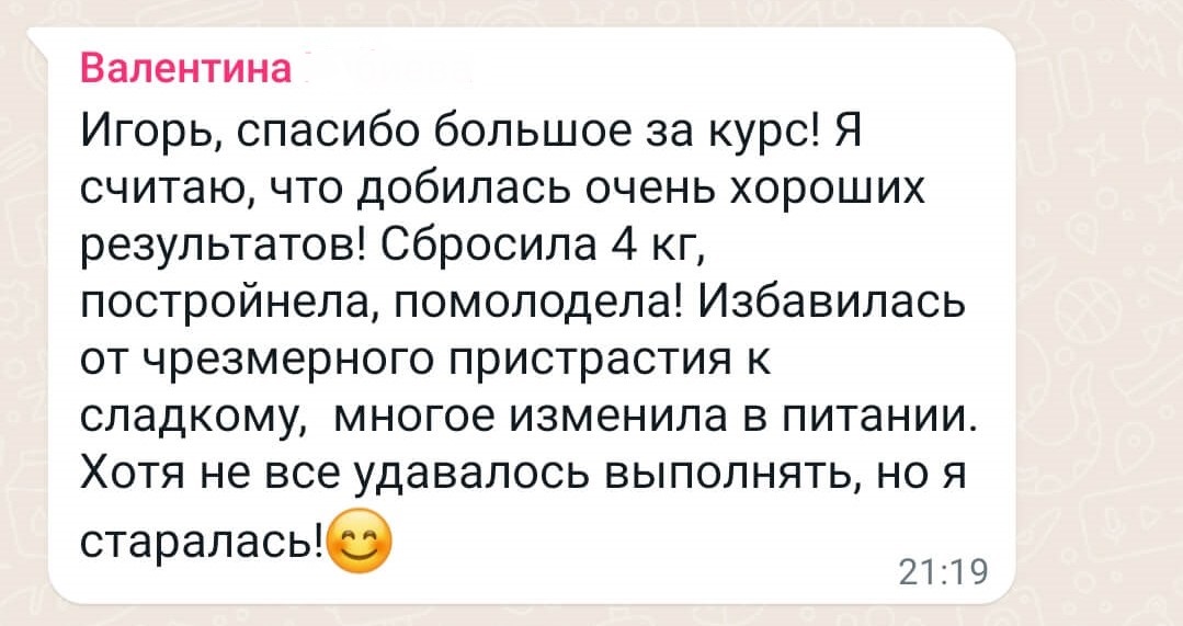 Игорь, спасибо большое за курс! Я считаю, что добилась очень хороших результатов! Сбросила 4 кг, постройнела, помолодела! Избавилась от чрезмерного пристрастия к сладкому, многое изменила в питании. Хотя не все удавалось выполнять, но я старалась! Оригинал отзыва