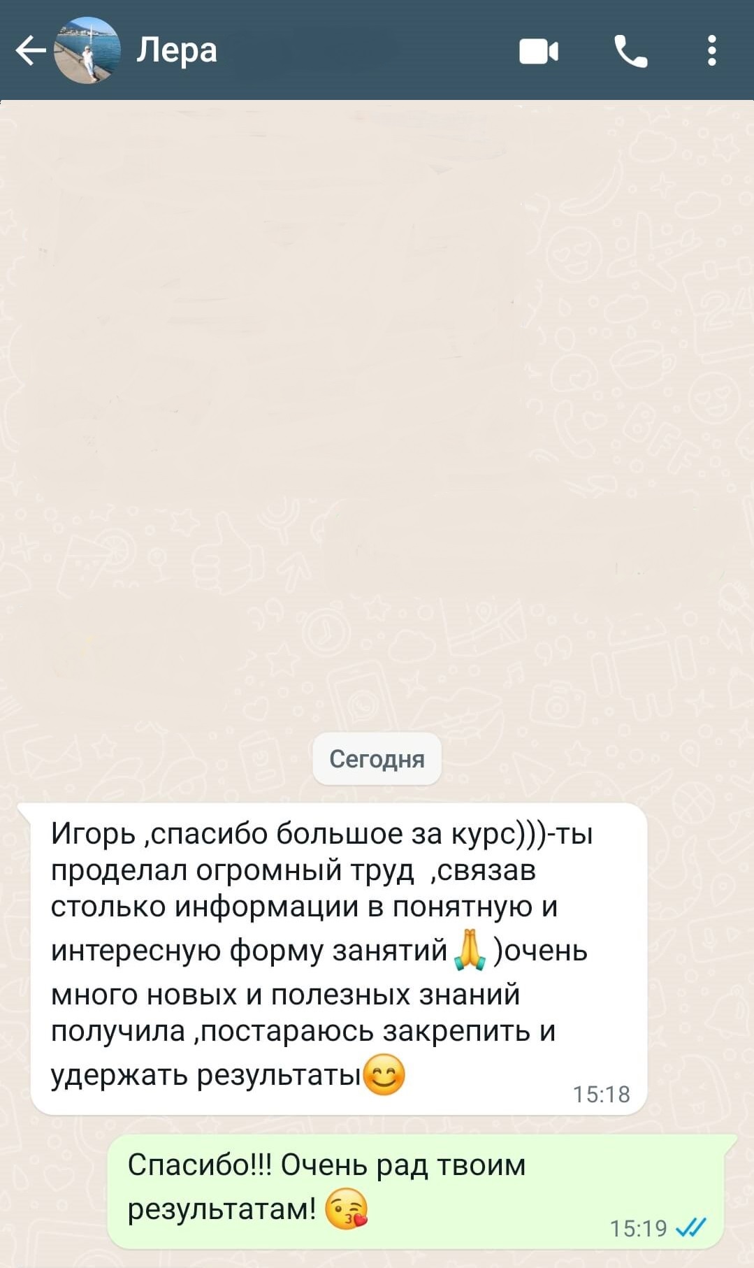 Игорь ,спасибо большое за курс)))-ты проделал огромный труд ,связав столько информации в понятную и интересную форму занятий)очень много новых и полезных знаний получила ,постараюсь закрепить и удержать результаты. Оригинал отзыва