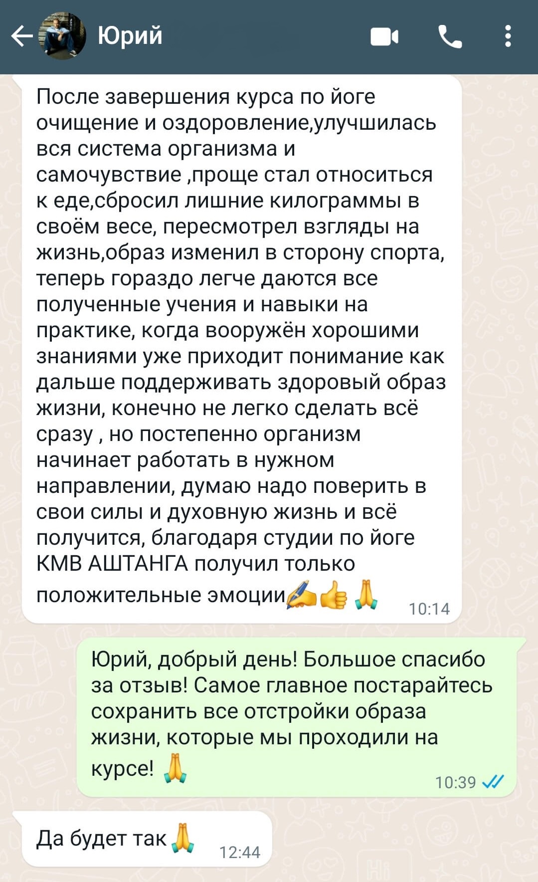 После завершения курса по йоге очищение и оздоровление,улучшилась вся система организма и самочувствие ,проще стал относиться к еде,сбросил лишние килограммы в своём весе, пересмотрел взгляды на жизнь,образ изменил в сторону спорта, теперь гораздо легче даются все полученные учения и навыки на практике, когда вооружён хорошими знаниями уже приходит понимание как дальше поддерживать здоровый образ жизни, конечно не легко сделать всё сразу , но постепенно организм начинает работать в нужном направлении, думаю надо поверить в свои силы и духовную жизнь и всё получится, благодаря студии по йоге КМВ АШТАНГА получил только положительные эмоции. Оригинал отзыва