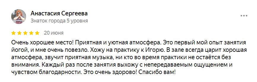 Очень хорошее место! Приятная и уютная атмосфера. Это первый мой опыт занятия йогой, и мне очень повезло. Хожу на практику к Игорю. В зале всегда царит хорошая атмосфера, звучит приятная музыка, ни кто во время практики не остаётся без внимания. Каждый раз после занятия выхожу с непередаваемым ощущением и чувством благодарности. Это очень здорово! Спасибо вам! Оригинал отзыва