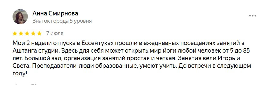 Мои 2 недели отпуска в Ессентуках прошли в ежедневных посещениях занятий в Аштанга студии. Здесь для себя может открыть мир йоги любой человек от 5 до 85 лет. Большой зал, организация занятий простая и четкая. Занятия вели Игорь и Света. Преподаватели-люди образованные, умеют учить. До встречи в следующем году! Оригинал отзыва